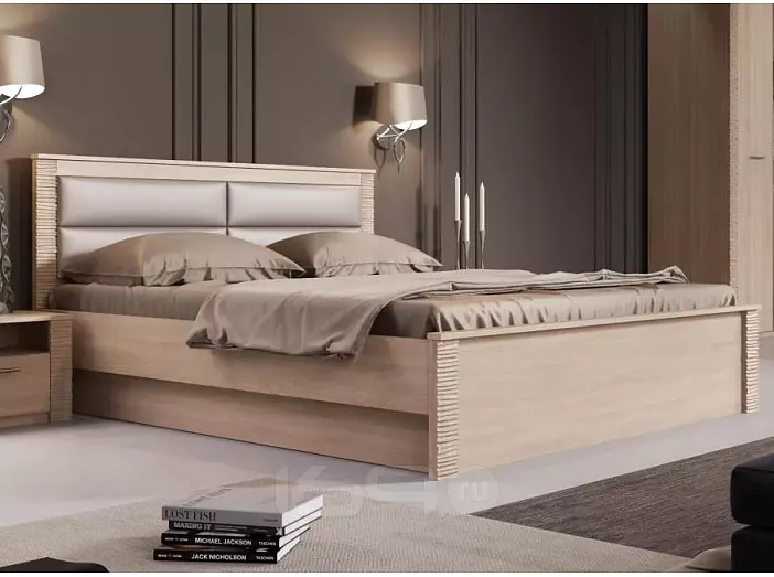 Кровать оснащена мягким изголовьем, состоящим из четырёх элементов, обтянутых экокожей.