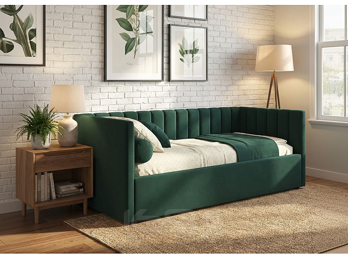 Мягкая кровать-тахта Milena (Милена) c ортопедическим основанием и спальным местом 120*200 – уникальный предмет мебели, который совмещает в себе полноценную кровать и диван. Тахта с двумя мягкими спинками выполнена из модной мебельной ткани – велюр. Ткань износостойкая, легко чистится от загрязнений (влажной тряпочкой, любыми средствами, кроме средств с растворителями), практичная, эластичная, устойчивая к ультрафиолету.