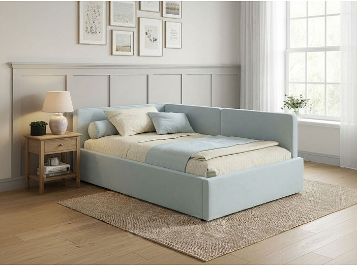 Мягкая дизайнерская кровать-тахта KAPRI со спальным местом 120х200 станет центром притяжения вашей изысканной спальни, детской или подростковой комнаты. Пышное мягкое изголовье с тремя спинками и декоративным итальянским кантом – выбор истинных ценителей стиля и комфорта._x000D_