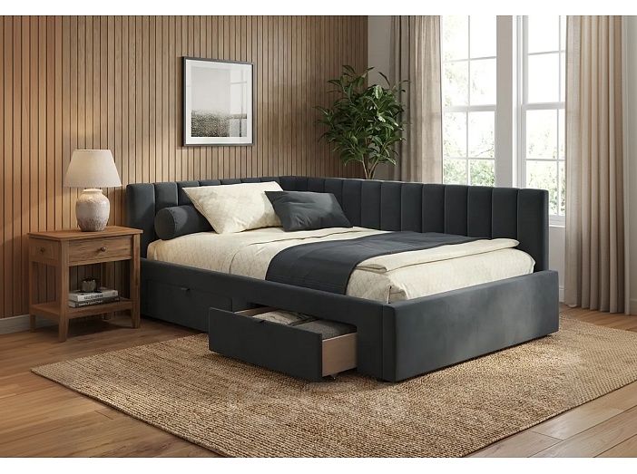 Мягкая кровать-тахта Milena (Милена) с ортопедическим основанием, выкатными ящиками и спальным местом 120*200 – уникальный предмет мебели, который совмещает в себе полноценную кровать и диван. Тахта с двумя мягкими спинками выполнена из модной мебельной ткани – велюр. Ткань износостойкая, легко чистится от загрязнений (влажной тряпочкой, любыми средствами, кроме средств с растворителями), практичная, эластичная, устойчивая к ультрафиолету.