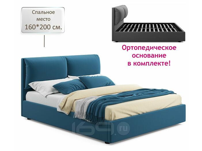 Кровать Vita с матрасом велюр синий без П/М 1600x2000, изголовье мягкое