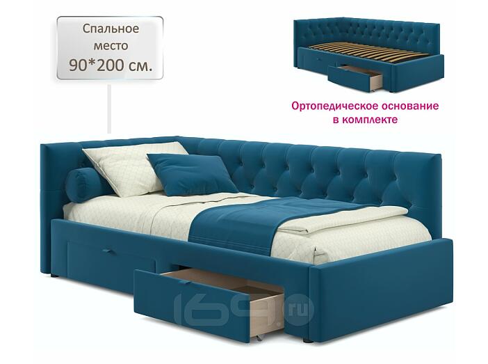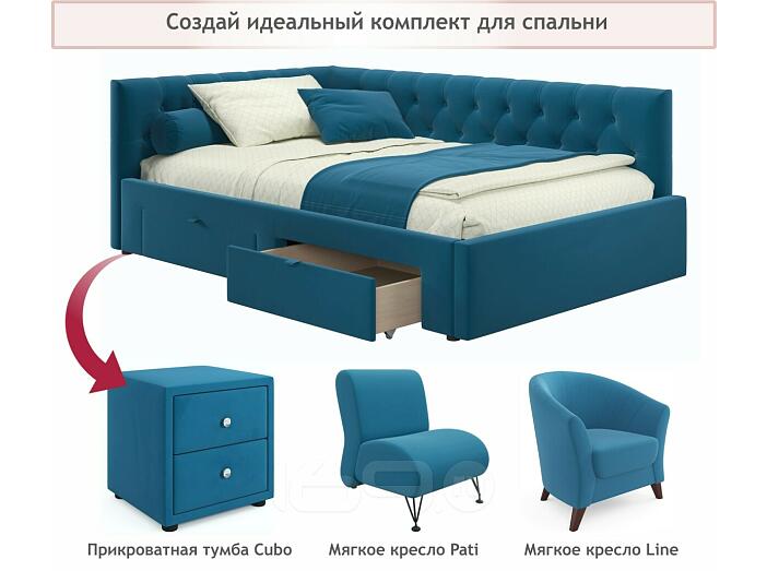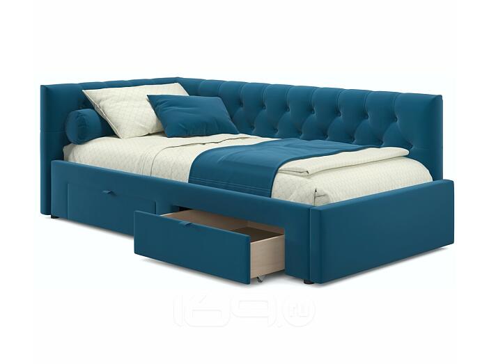 Кровать Afelia с матрасом велюр синий без П/М 900x2000, изголовье мягкое