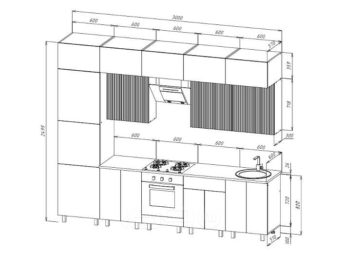 Верхние модули:ШВ1Д 600 - 60 х 71.8 х 30 см - 3 шт.;ШВГА 600/360 - 60 х 35.9 х 57 см - 5 шт.