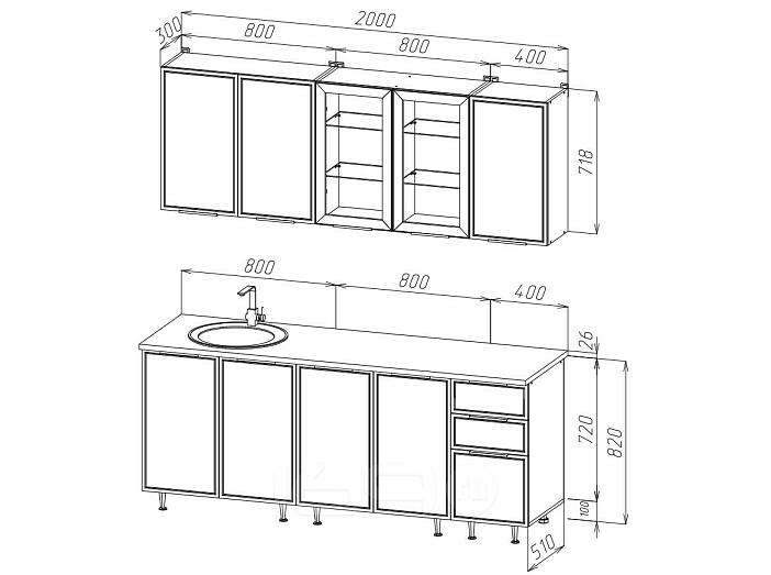 Верхние модули:ШВ 400 - 40 х 71.8 х 30 см - 1 шт., ШВ 800 - 80 х 71.8 х 30 см - 1 шт., ШВСП 800 - 80 х 71.8 х 30 см - 1 шт.