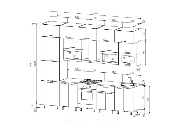 Верхние модули:ШВГА 600х360 (600x360x570 мм) - 5 шт., ШВГС 600 (фасад со стеклом ШВГСР600) (600x718x300 мм) - 3 шт.