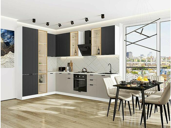 Модульный кухонный гарнитур Евро Лайн-07 Антрацит, Агат/Белый 2340x2000/3000x600 Полки стекло