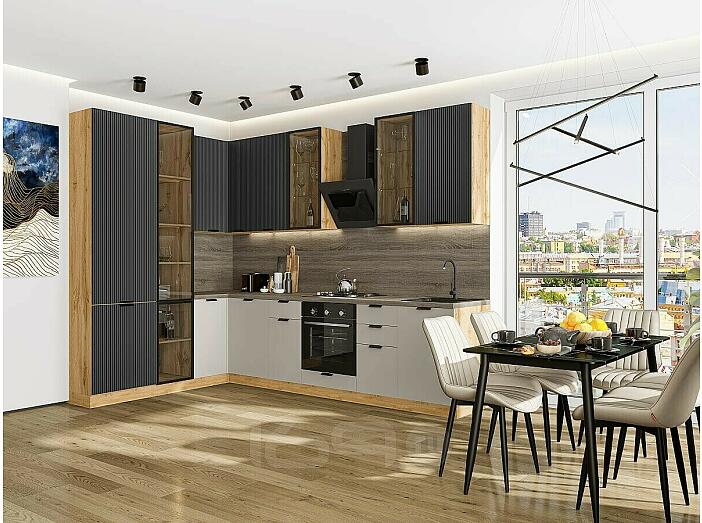 Модульный кухонный гарнитур Евро Лайн-07 Антрацит, Агат/Дуб Вотан 2340x2000/3000x600 Полки стекло