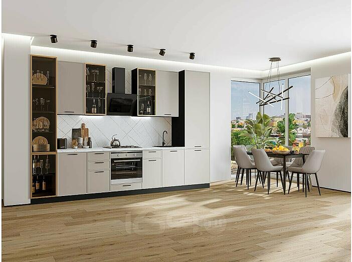 Модульный кухонный гарнитур Фрейм-06 Clay Silk/Graphite 2340x3400x600 Полки стекло
