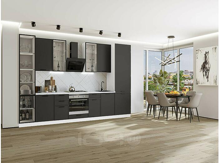 Модульный кухонный гарнитур Фрейм-06 Stormy Silk/Белый 2340x3400x600 Полки стекло