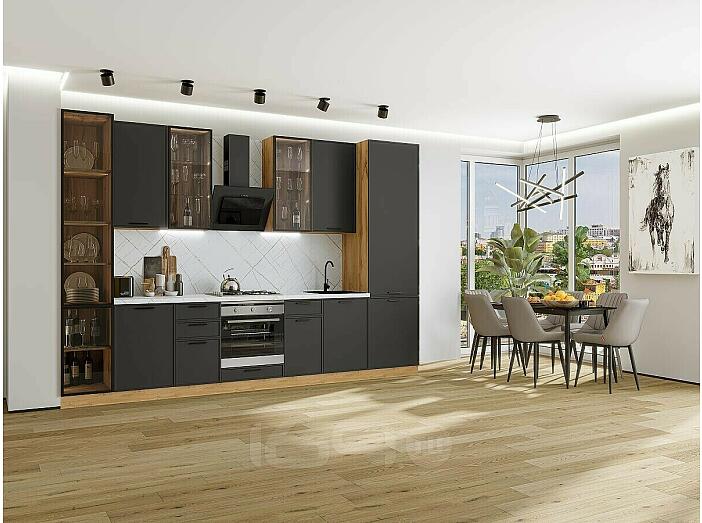 Модульный кухонный гарнитур Фрейм-06 Stormy Silk/Дуб Вотан 2340x3400x600 Полки стекло
