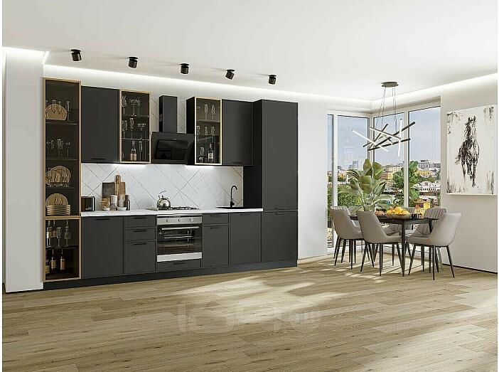 Модульный кухонный гарнитур Фрейм-06 Stormy Silk/Graphite 2340x3400x600 Полки стекло