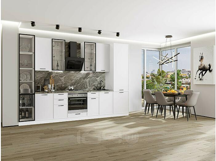 Модульный кухонный гарнитур Фрейм-06 White Silk/Белый 2340x3400x600 Полки стекло