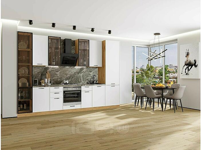 Модульный кухонный гарнитур Фрейм-06 White Silk/Дуб Вотан 2340x3400x600 Полки стекло