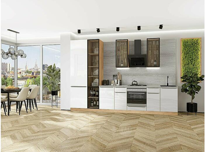 Модульный кухонный гарнитур Фьюжн-08 Angel/Дуб Вотан 2340x3400x600 Полки стекло