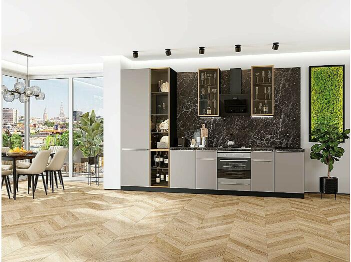 Модульный кухонный гарнитур Фьюжн-08 Clay Silk/Graphite 2340x3400x600 Полки стекло