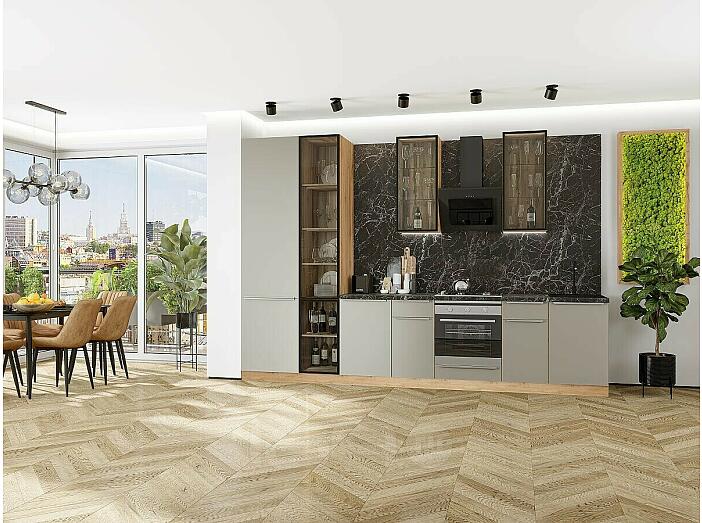 Модульный кухонный гарнитур Фьюжн-08 Silky Grey/Дуб Вотан 2340x3400x600 Полки стекло
