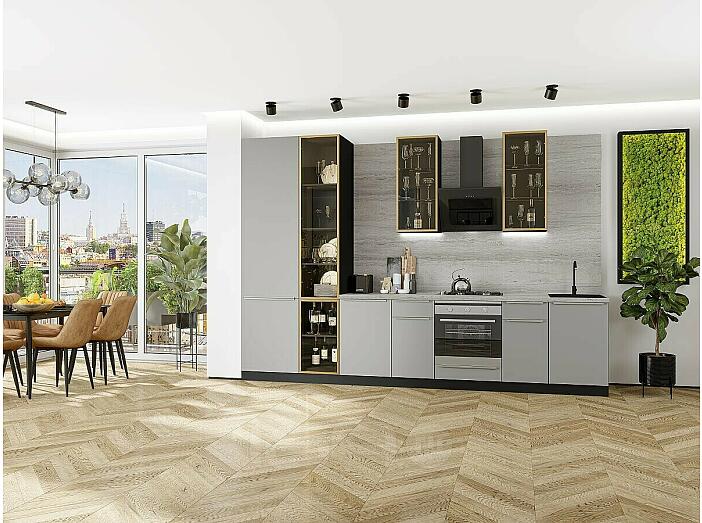 Модульный кухонный гарнитур Фьюжн-08 Silky Light Grey/Graphite 2340x3400x600 Полки стекло