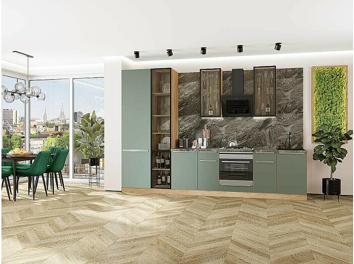Модульный кухонный гарнитур Фьюжн-08 Silky Mint/Дуб Вотан 2340x3400x600 Полки стекло