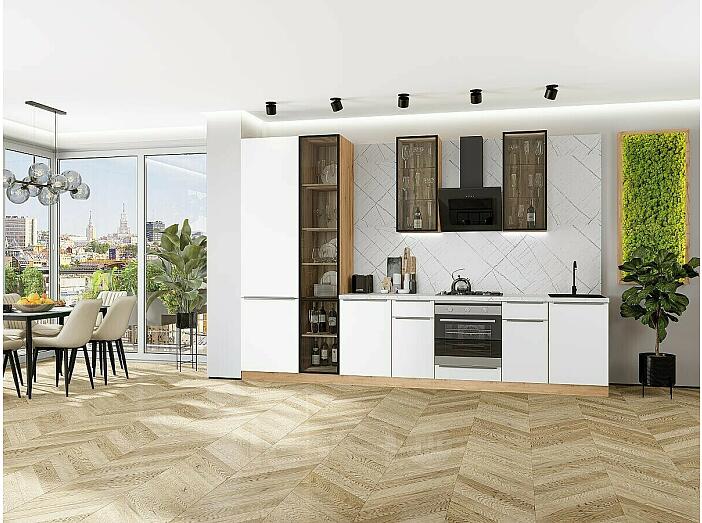 Модульный кухонный гарнитур Фьюжн-08 Silky White/Дуб Вотан 2340x3400x600 Полки стекло