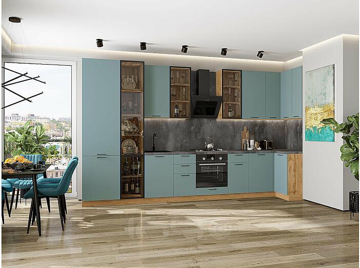 Кухня угловая Флэт-05 Grey-green In 2S/Дуб Вотан Полки ЛДСП 2340*4000/1000*600