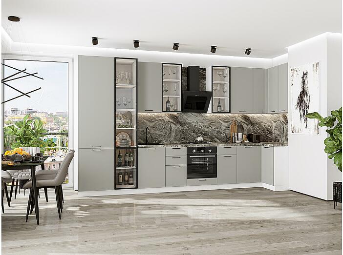 Кухня угловая Флэт-05 Light Grey In 2S/Белый Полки ЛДСП 2340*4000/1000*600