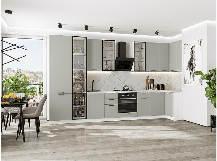 Кухня угловая Флэт-05 Light Grey In 2S/Белый Полки Стекло 2340*4000/1000*600