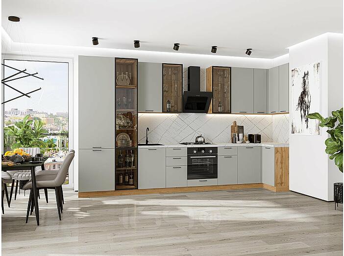 Кухня угловая Флэт-05 Light Grey In 2S/Дуб Вотан Полки Стекло 2340*4000/1000*600