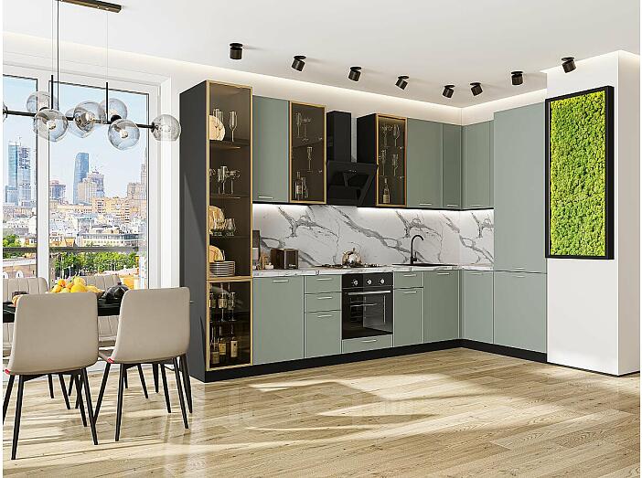 Кухня угловая Квадро-04 Аквамарин/Graphite Полки Стекло 2340*3400/1600*600