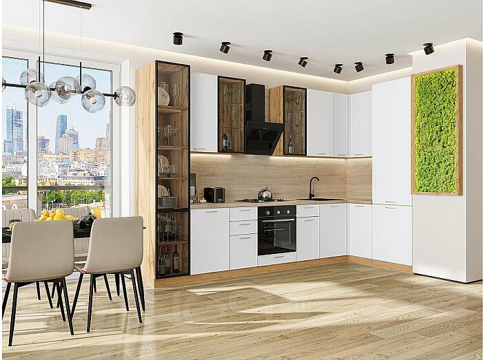 Кухня угловая Квадро-04 Белый/Дуб Вотан Полки Стекло 2340*3400/1600*600