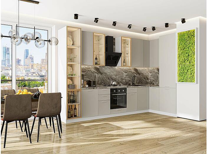 Кухня угловая Квадро-04 Кашемир/Белый Полки Стекло 2340*3400/1600*600