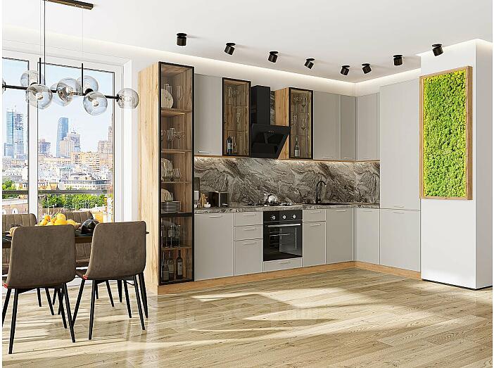 Кухня угловая Квадро-04 Кашемир/Дуб Вотан Полки Стекло 2340*3400/1600*600