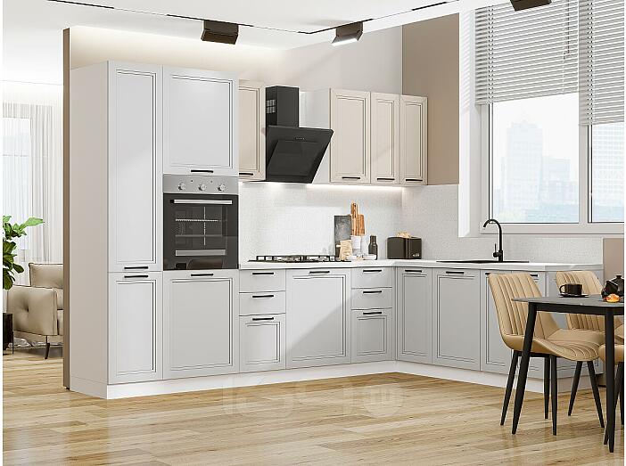 Кухня угловая Нео-03 Cream Silk/Grey Silk/Белый 2140*3000/2100*600