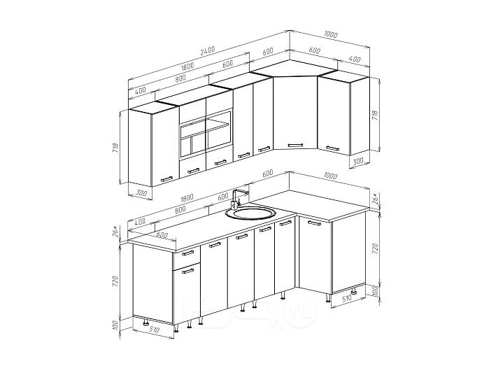 Верхние модули:ШВ 400 - 40 х 71.8 х 29.6 см - 2 шт., ШВС 800 - 80 х 71.8 х 29.6 см - 1 шт., ШВ 600 - 60 х 71.8 х 29.6 см - 1 шт., ШВУ 600 - 60 х 71.8 х 60 см - 1 шт.
