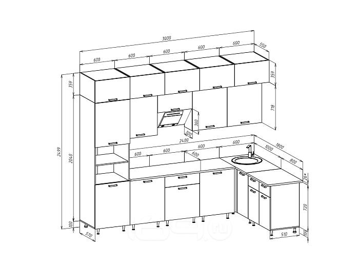 Нижние модули:ШП 600 - 60 х 214 х 55.3 см -1 шт., ШН1Я1Д 600 - 60 х 84.6 х 49 см - 1 шт., ШН1Д 600 - 60 х 84.6 х 49 см - 2 шт., ШН2Я 800 - 80 х 84.6 х 49 см - 1 шт., ШНУ 1000 - 100 х 84.6 х 49 см - 1 шт.