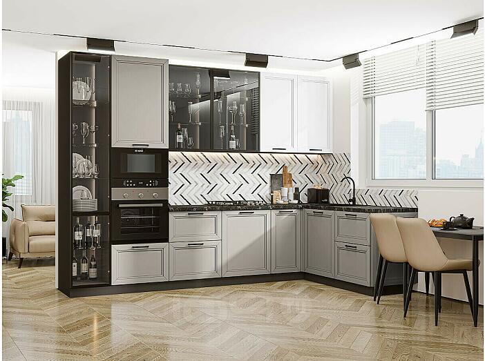 Модульный кухонный гарнитур Нео-04 White Silk, Clay Silk/Graphite 2340x3200/1800x600 Полки стекло