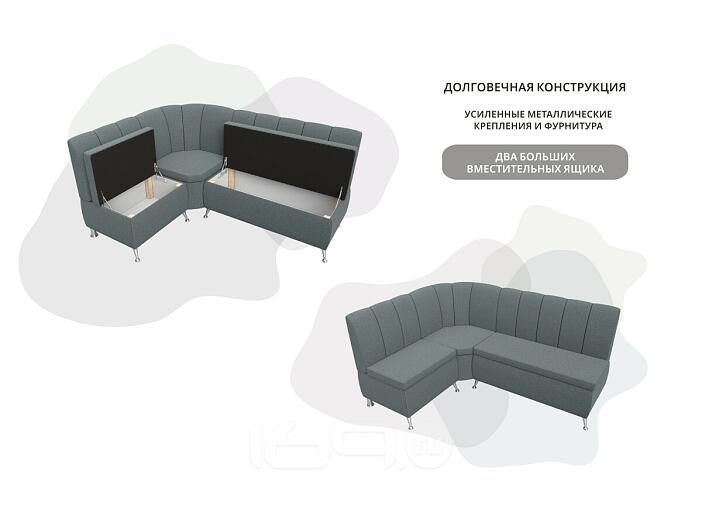 Компактный угловой диван Кантри – именно то, что нужно для полноценного обустройства кухни. Он удобный и функциональный. Под продольными сиденьями находятся вместительные ящики. Угол сплошной, не открывается. Модель практичная: водоотталкивающая ткань идеально подойдет для семей с маленькими детьми.