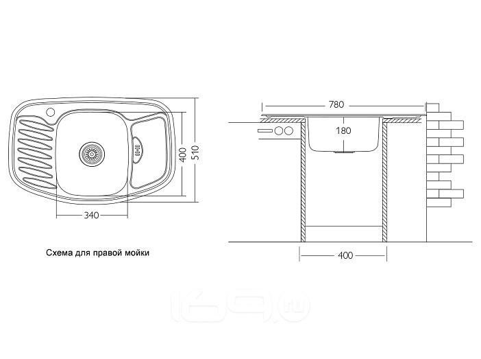 Кухонная врезная мойка 785118/0,8 1Ч2К с одной чашей и двумя крыльями. Подходит для тумб от 45 см. Чаша снаружи покрыта шумопоглощающей пленкой. Площадка под смеситель слева от чаши в верхней части, выпускается с переливом для воды в чаше.