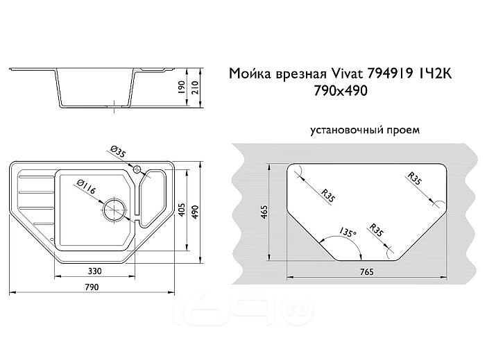 Кухонная врезная мойка Vivat 794919 1Ч2К с двумя крылами и одной чашей. Подходит для углового шкафа (трапеция) НУ 890.
