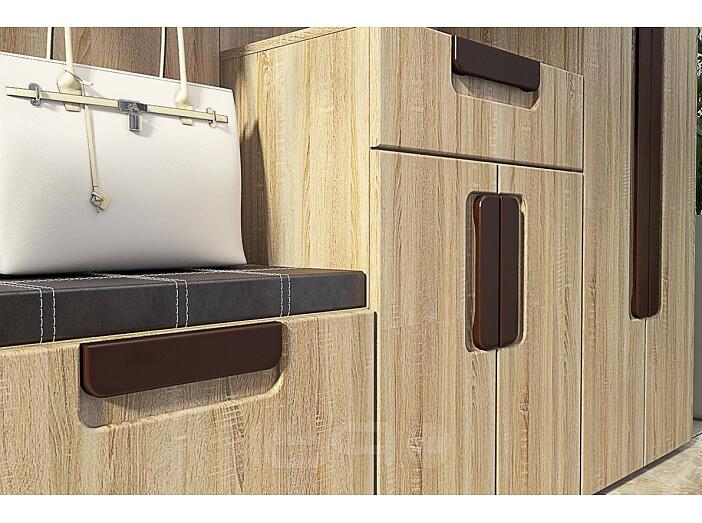 Корпус прихожей изготовлен из 16 мм древесностружечной плиты, кашированной финиш-пленкой «Дуб Сонома». Видимые части каркасов закромлены кромкой ABS. Невидимые части каркасов закромлены меламиновой кромкой. Фасады изготовлены из 16 мм МДФ плиты, покрытой пленкой ПВХ «Дуб Сонома». В шкафной секции предусмотрена выдвижная штанга под одежду. На выбор предлагается два варианта мягких сидений для тумбы с крючками под одежду. Ручки изготовлены из 16 мм МДФ плиты, покрытой пленкой ПВХ «Шоколад Глянец» или «Белый Глянец». Выдвижные ящики установлены на шариковые направляющие. Модули установлены на пластиковые регулируемые опоры.