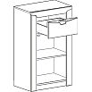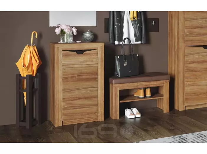Тумба имеет распашную дверцу, за которой скрывается достаточно места для хранения обуви, а выдвижной ящик идеально подходит для хранения мелких предметов, таких как ключи, перчатки и шапки. Для открывания двери внутри устанавливается система Push to open открывающая ее после нажатия. На открытой полке можно разместить аксессуары или декор, чтобы добавить индивидуальности прихожей.