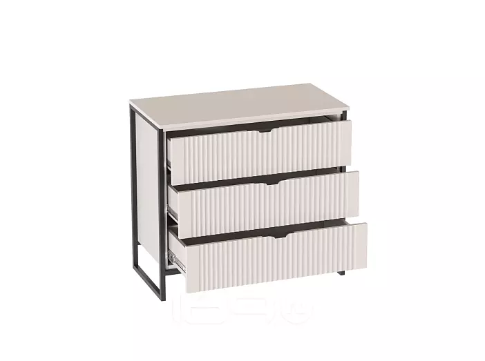 Комод "Нора" на металлокаркасе состоит из трех выдвижных ящиков на шариковых направляющих, что позволяет удобно хранить вещи и поддерживать порядок в комнате. Он выполнен из безопасных, качественных материалов (лдсп и мдф), что гарантирует долговечность и сохранение первоначального вида на протяжении долгого времени.
