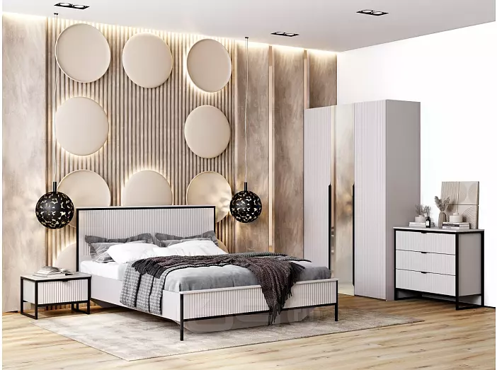Коллекцию модульной спальни "Нора" отличает современный оригинальный стиль. Декоративная продольная фрезеровка на фасадах из МДФ и опоры на металлокаркасе цвета "Черная эмаль" соответствуют модным тенденциям этого года в ведущих зарубежных коллекциях.