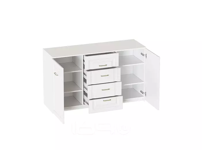Комод выполнен в цвете Айс 06 / Белый Аляска. Классическая фрезеровка фасадов и ручки-скобы из брашированного золота придают изделию особый шарм и элегантность. Комод с полупроходными боками, прямоугольной крышкой и дном. Внутри пространство разделено на три секции. В средней секции расположены 4 ящика на шариковых направляющих без доводчика, крайние секции закрыты распашными дверями на петлях с доводчиком, за которыми расположены съемные полки. Дно и задние стенки выполнены из ХДФ. На опорах размещены войлочные подпятники.