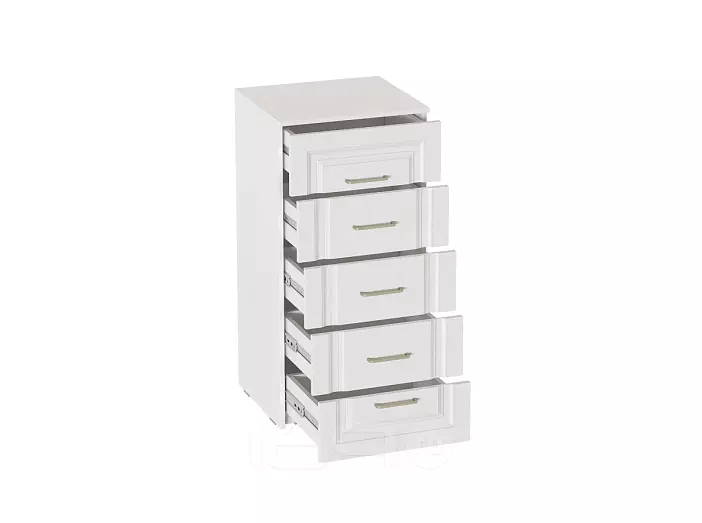 Комод выполнен в цвете Айс 06 / Белый Аляска. Классическая фрезеровка фасадов и ручки-скобы из брашированного золота придают изделию особый шарм и элегантность. Ящики полного выдвижения на шариковых направляющих скользят бесшумно и плавно. Дно и задние стенки выполнены из ХДФ. На опорах размещены войлочные подпятники.