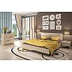 Все элементы спальни изготовлены из высокопрочной ламинированной древесно-стружечной плиты (ЛДСП), выдержаны в нежной светлой гамме «Ясень Лион песочный», подчеркнутой темным оттенком «Дуб Феррара», и украшены плавными изогнутыми линиями.