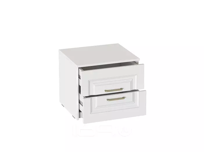 Тумба выполнена в цвете Айс 06 / Белый Аляска. Классическая фрезеровка фасадов и ручки-скобы из брашированного золота придают изделию особый шарм и элегантность. Тумба оснащена двумя ящиками полного выдвижения на шариковых направляющих, которые скользят бесшумно и плавно. Дно и задние стенки выполнены из ХДФ. На опорах размещены войлочные подпятники.
