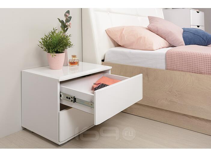 Миниатюрные выдвижные ящики прикроватной тумбы открываются простым нажатием на фасад.