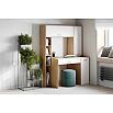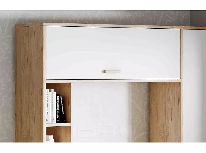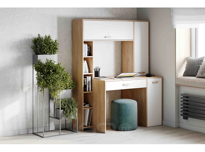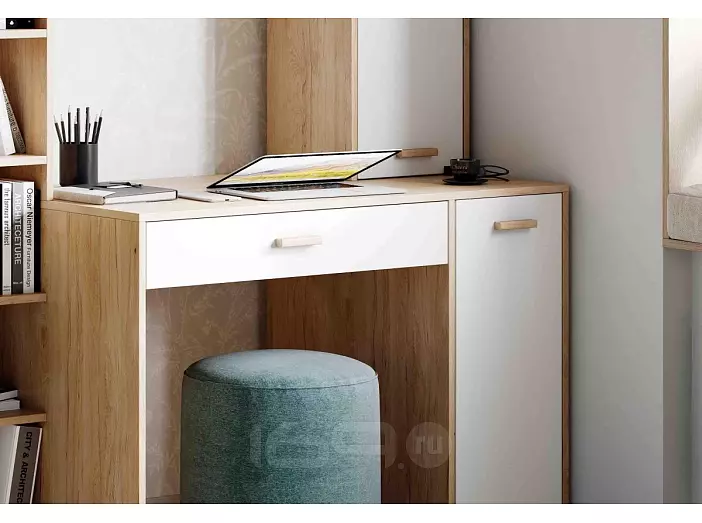 Внутреннее пространство разделено на 3 закрытых зоны: правая зона оснащена 1 съемной и 3 жесткими полками. Левая зона представлена в виде открытой ниши с полками. Верхнее отделение разделено на 2 части перегородкой. Под столешницей расположен ящик на шариковых направляющих.