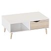 Стол журнальный "Соната" с прямоугольной столешницей и дном, которые соединены между собой непроходными стенками. Стол разделён на два отделения: одно из них открытое, а в другом находится ящик с фасадом декорированным вырезной ручкой, который можно выдвигать в обе стороны стола. Ящик не прикреплён к корпусу стола, а скользит по его дну на войлочных подпятниках.