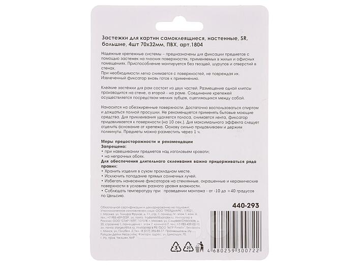 Застежки для картин самоклеящиеся, настенные, SR, большие, 4шт 70х32мм, ПВХ, арт.1804
